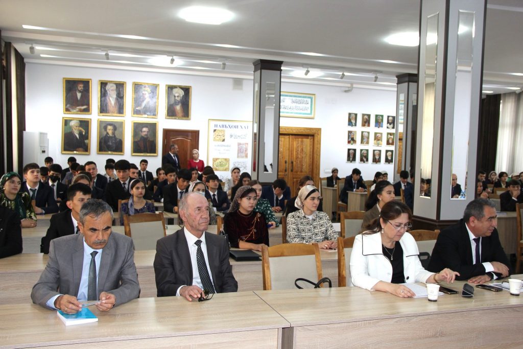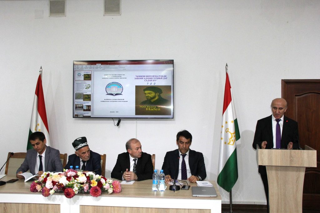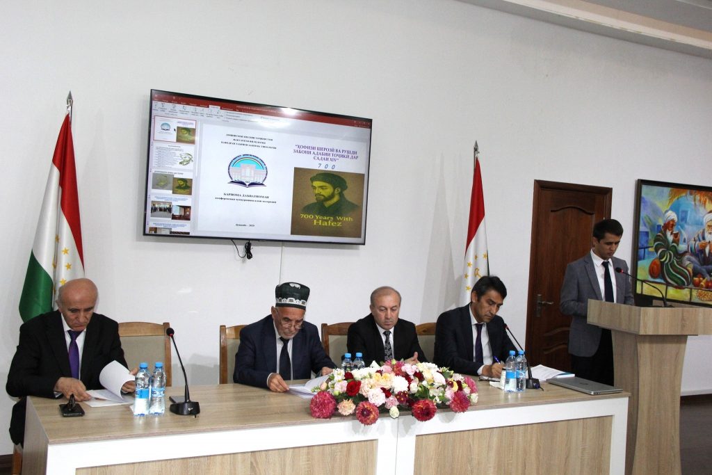 Имрӯз (15.10.2025) дар пояи кафедраи таърихи забон ва типологияи факултети филологияи Донишгоҳи миллии Тоҷикистон бахшида ба 700-солагии Ҳофизи Шерозӣ дар мавзуи «Ҳофизи Шерозӣ ва рушди забони адабии тоҷикӣ дар асри XIV» ҳамоиши ҷумҳуриявии илмӣ – назариявӣ баргузор гардид.